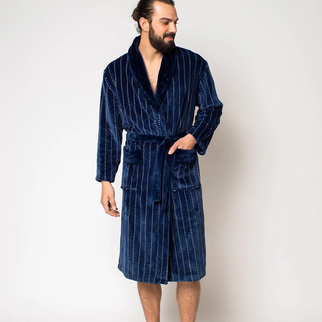 Cálida y suave Bata en coralina Océano para hombre. La Bata en coralina Azul marino es una bata de invierno para hombre fabricada en cálida coralina de tacto extrasuave fabricada por Blanca Hernández, símbolo de calidad.