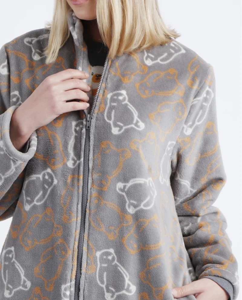– Bata de tejido especial Corel muy calentito. De color gris. Con bolsillos.