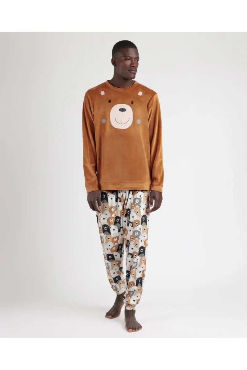 – Pijama de tejido especial de terciopelo elástico. De manga larga. Cuello redondo y pantalón largo.