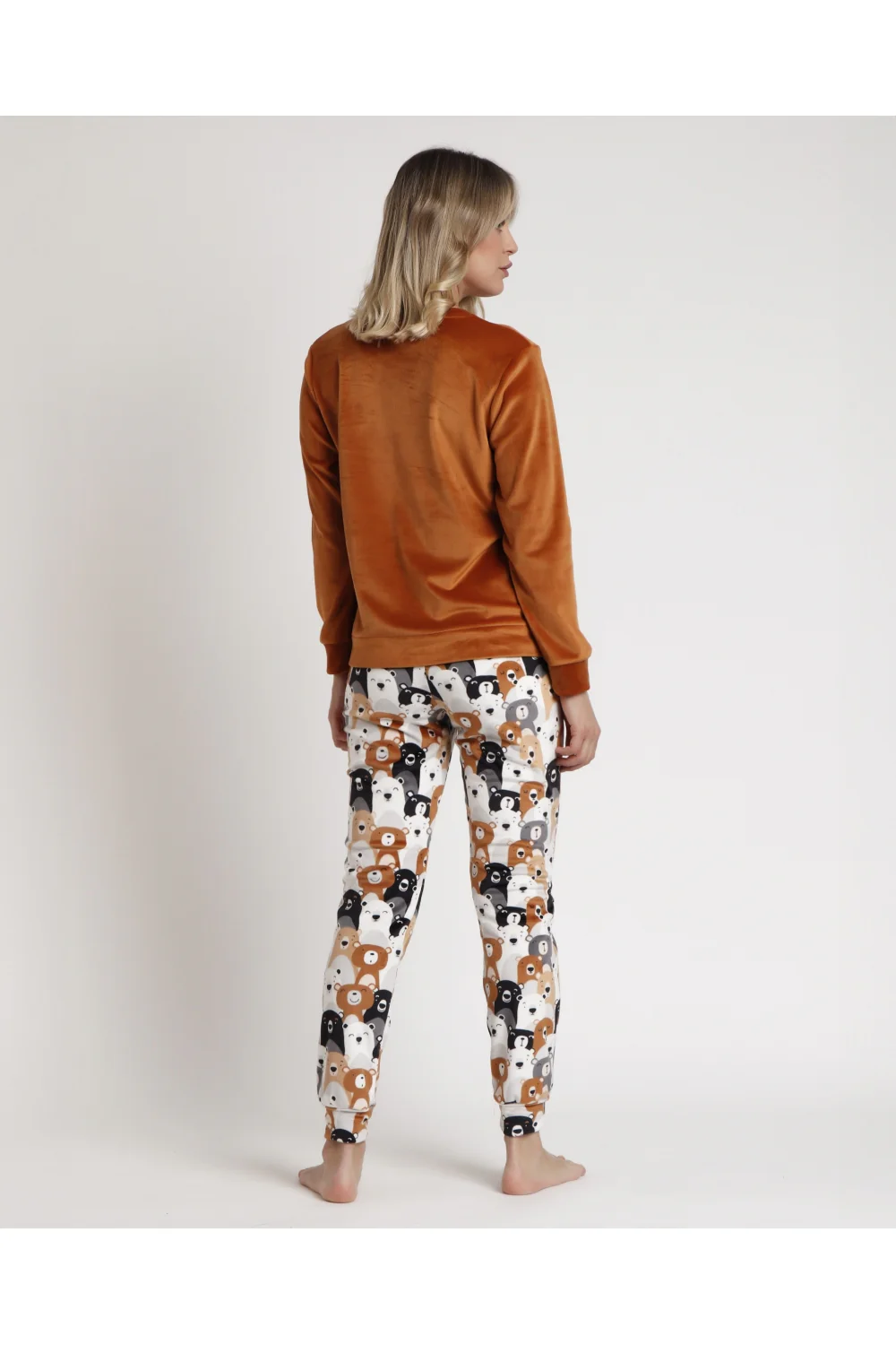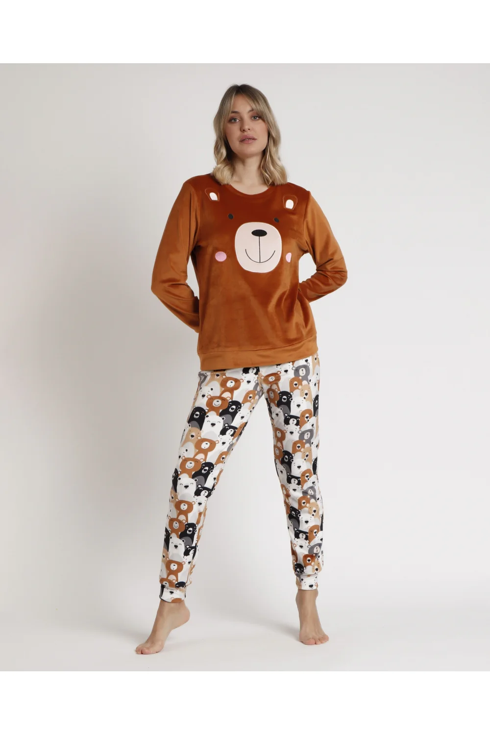 – Pijama de tejido especial de terciopelo elástico. De manga larga. Cuello redondo y pantalón largo.