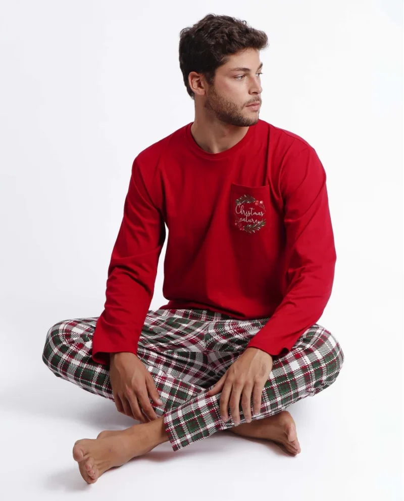 – Pijama de punto de algodón. De manga larga. Cuello redondo y pantalón largo.